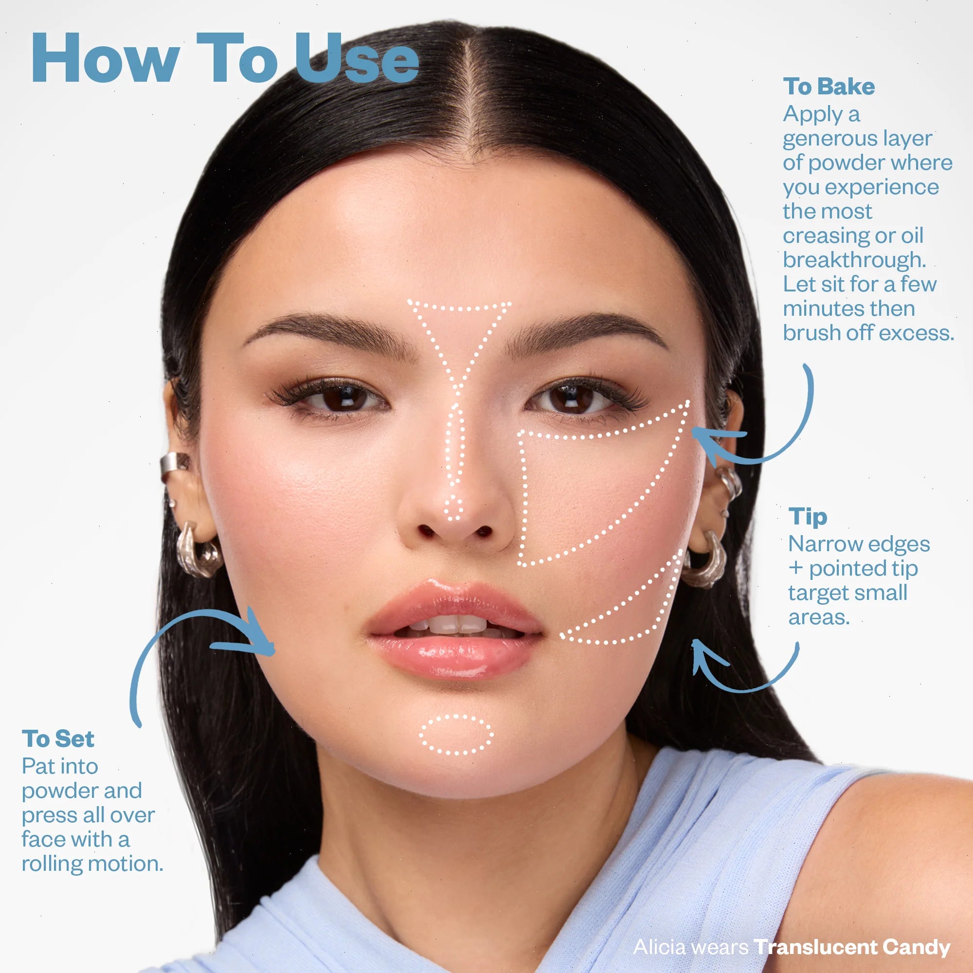 2 triangular, soft velvet puffs that easily pick up and apply powder for a seamless setting and baking experience. Only available on Kosas.com.